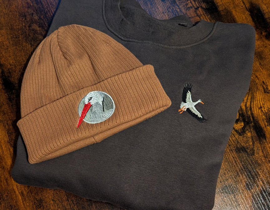 I embroider clothing, Paul makes woodwork like bug hotels and frog logs that people can use to give nature a little boost in their own gardens. I’ve made two new stork designs, with which we hope to do two things: first, to help raise funds in direct support of the White Stork Project, 10% of the sale price from each piece sold will be donated to the project. Secondly, to help extend awareness, carrying the story of the storks and their return into new spaces.